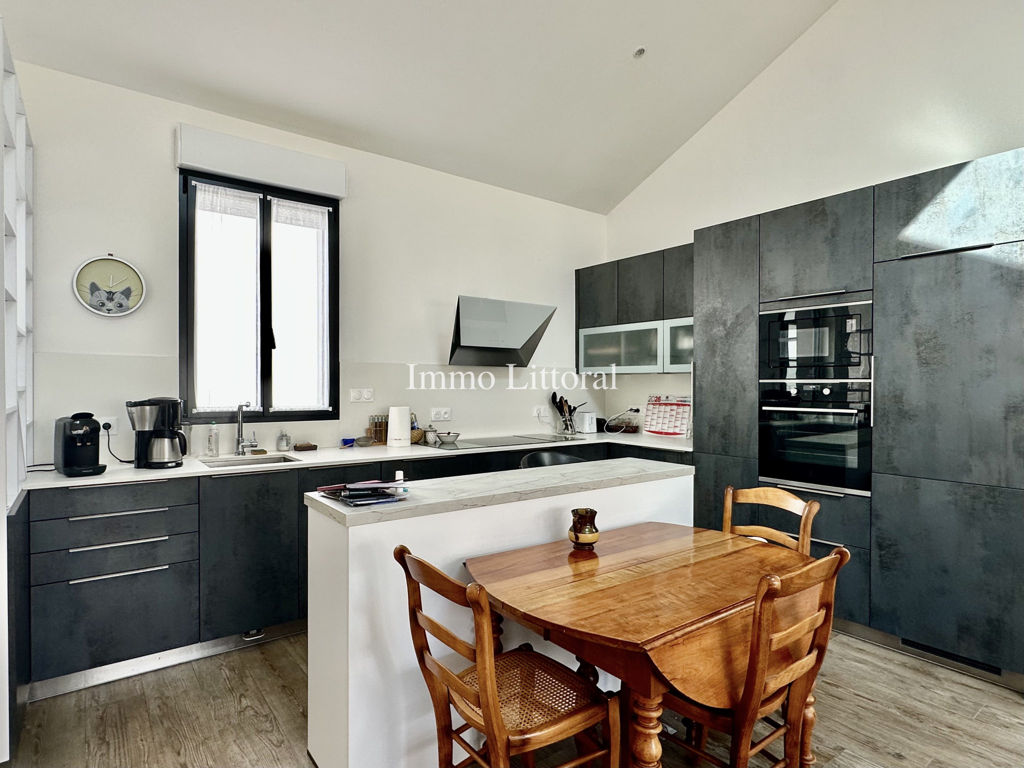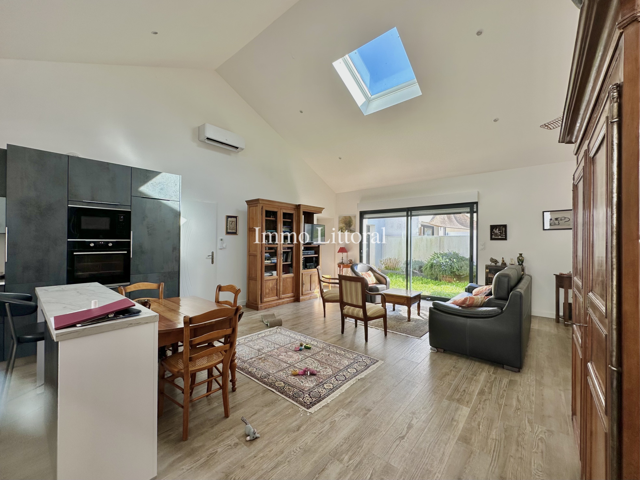 SPACIEUSE PIÈCE DE VIE AVEC CUISINE AMÉNAGÉE ET ÉQUIPÉE DONNANT SUR JARDINET
