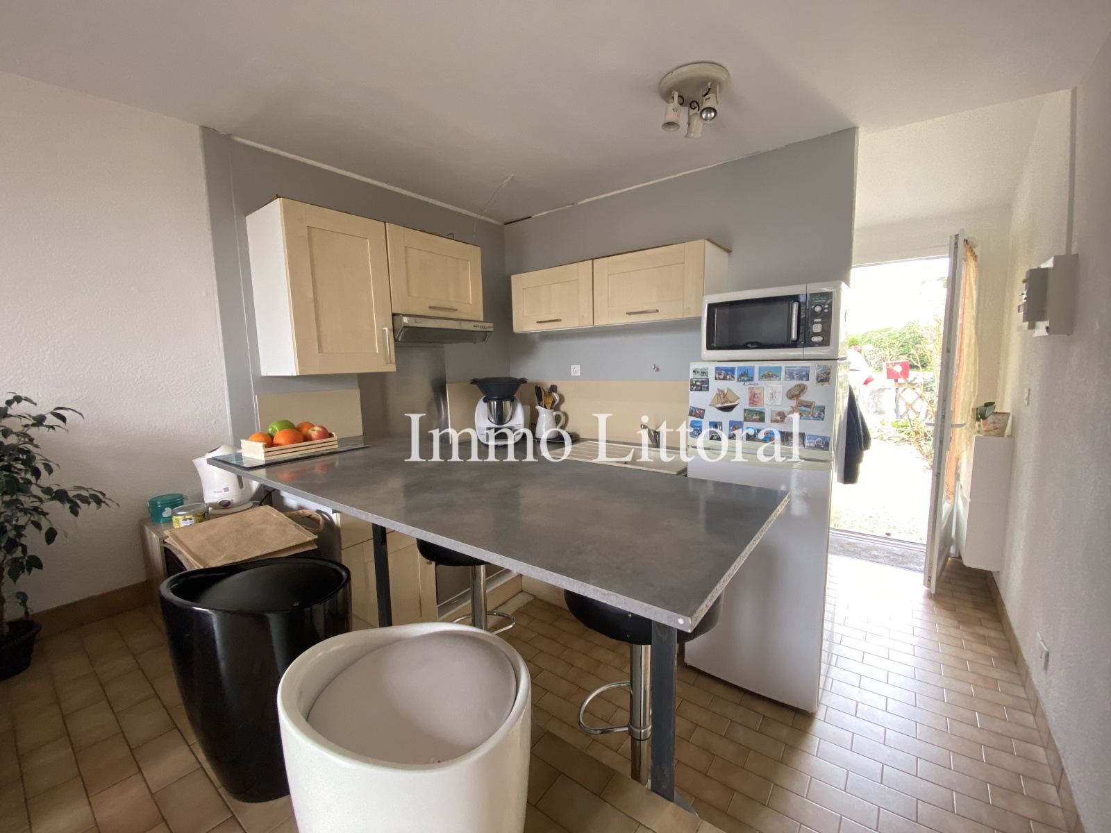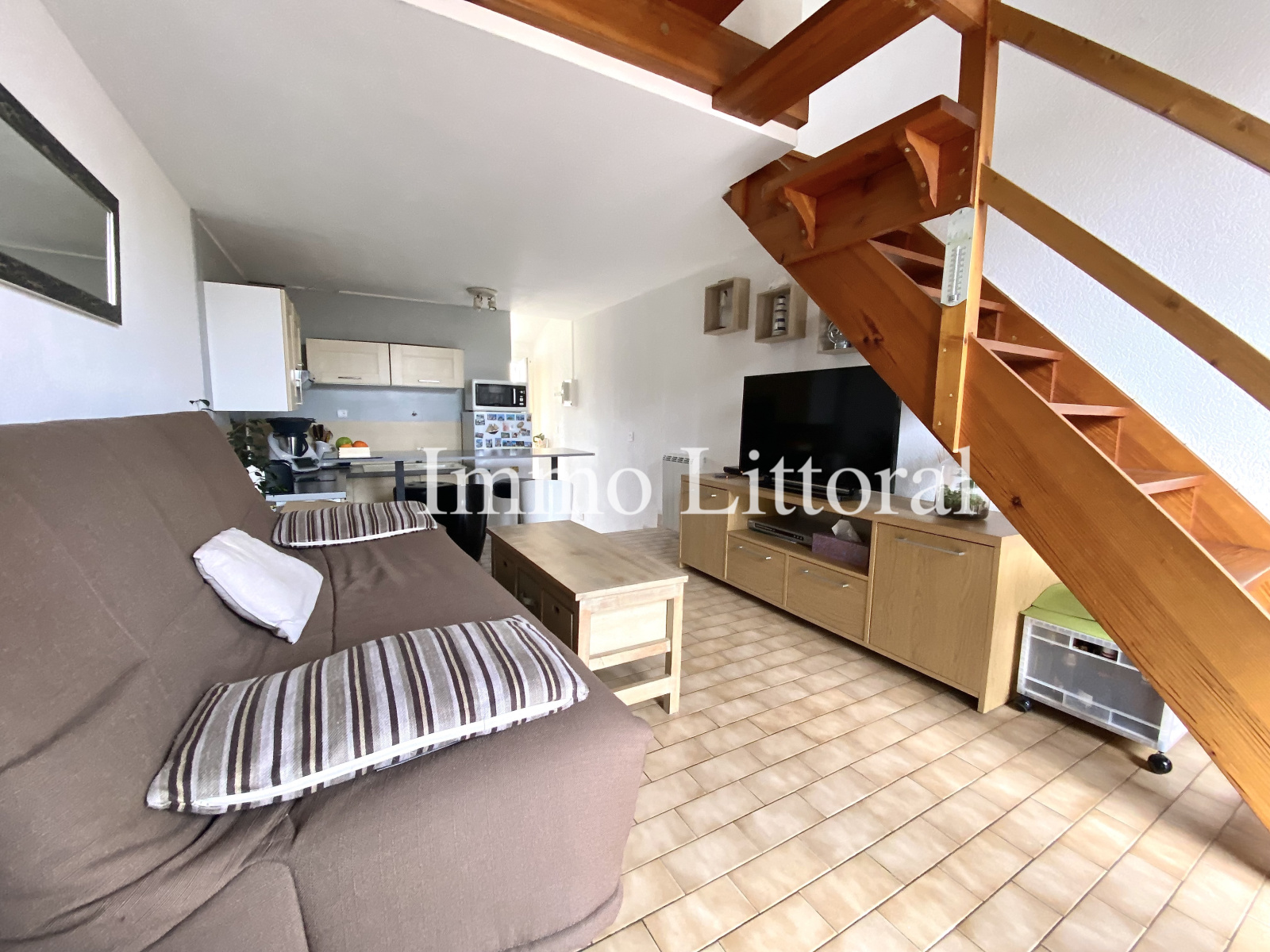 au rez-de-chaussée : salon/séjour, kitchenette, salle d'eau avec water-closets